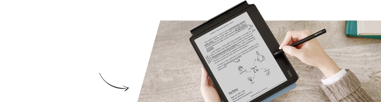 Put conventional paper aside and think bigger with an intuitive note-taking experience and an expansive 10.3” touchscreen. Use the Kobo Stylus to make notes in eBooks and PDFs*. Plus, you can create your own notebooks, where you can instantly convert your notes to clean typed text, and export them off your device as needed. With 32GB of storage, you'll be able to carry more than your book bag can handle. When you want to listen to a story, enjoy Kobo Audiobooks with Bluetooth® wireless technology†. And when you're ready for a break, simply close the SleepCover to protect Kobo Elipsa and put it to sleep. Kobo Elipsa is your book, notebook, and bookstore combined, bundled with everything you need to make your ideas a reality.